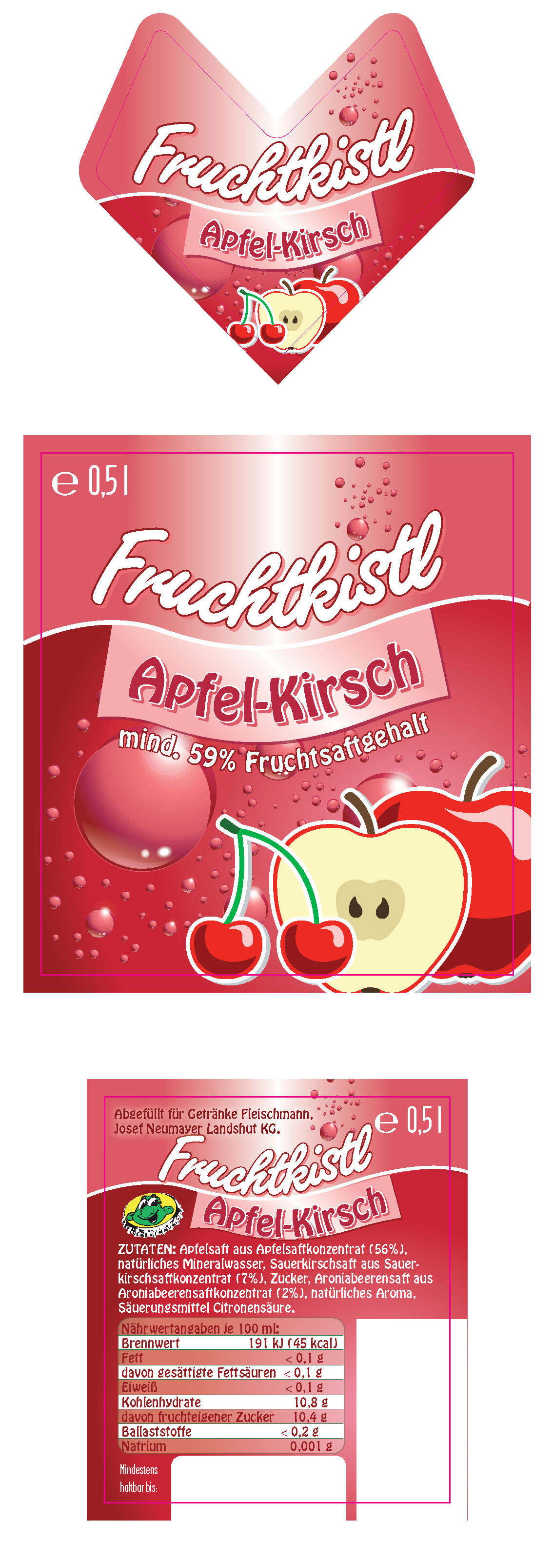 Die bekannte Handelsmarke „Fruchtkistl“ wurde komplett neu gestaltet, ein modernes, klares und illustratives Design für das gesamte Sortiment in Szene gesetzt. Für die sechs Sorten „Cola-Mix„, „Zitronen-Limonade„, „Orangen-Limonade„, „Orangen-Limonade„, „Apfel-Schorle„, „Apfel-Kirsch“ und „Citron“ wurde ein prägnantes und plakatives Farbdifferenzierungsschema entwickelt.